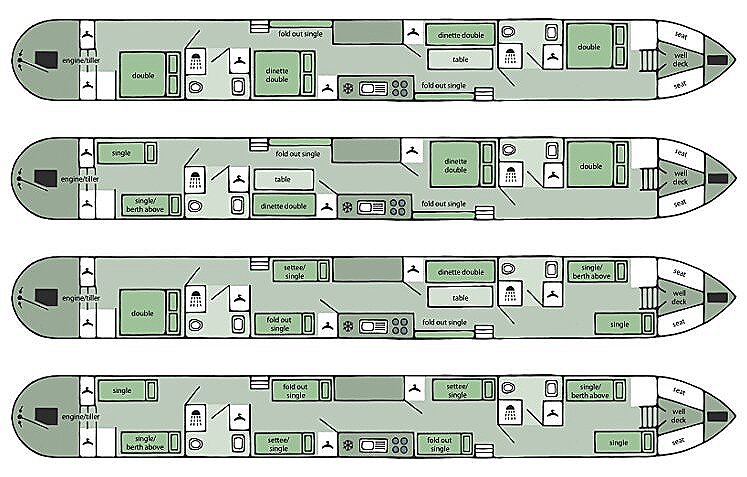 Båtarna har två separata hytter, en i fören och en i aktern. Varje hytt kan möbleras med antingen en dubbelsäng eller två enkelsängar. Väljer ni enkelsängar finns även möjlighet att lägga till en överslaf i respektive hytt (maxvikt 63 kg), vilket gör det enkelt att anpassa båten efter just ert resesällskap. Ombord finns dessutom två salonger som snabbt kan omvandlas till bekväma sovplatser för ytterligare fyra personer, vilket gör Owl/Wagtail till ett mycket bra val när man är många som reser tillsammans.